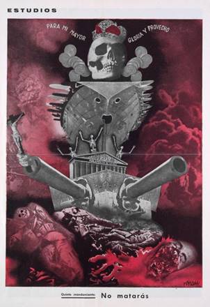 Algunos de estos fotomontajes tienen un siniestro componente de pesadilla que se proyecta fantasmagóricamente. En el caso de “No matarás” (Fig.1), la calavera preside toda la maquinaria de guerra que avanza implacable para extender el imperio de la Muerte y no se detiene ante la multitud de criaturas a las que apisona sin compasión. “No fornicarás” desenmascara la hipocresía del gran proxeneta, un cerdo bien vestido con lente de aumento, que mantiene las casas de prostitución. Mientras que alienta a la concupiscencia, entroniza la imagen de la Inmaculada. Paradójicamente, en “No robarás” se roba a manos llenas con el beneplácito de las autoridades que, como la Banca, invierte su capital en la fabricación de armas sin reparar más que en su propio interés y nunca en la destrucción que provoca. En “No desearás a la mujer de tu prójimo” caricaturiza la moral de la sociedad capitalista con su árbol genealógico, presidido por unos enormes cuernos de ciervo en los que luce cada una de las infidelidades que han dado lugar a su proterva genealogía. Ese mismo sentido tiene la serie de montajes “El buen vivir de España”, que denuncia el atraso, la ignorancia, la hipocresía y la tolerancia al mal de aquellos años. Por otra parte, las ilustraciones de “Los trece puntos de Negrín” constituían un programa político de carácter moderado cuyo objetivo era alcanzar el apoyo de las potencias extranjeras en la lucha contra los insurrectos militares e igualmente dignos de mención son las secciones de Nueva Cultura “Hombres grandes y hombres funestos de la Historia” o “Testigos negros de nuestro tiempo”, donde destaca la factura estética de las diferentes vanguardias.