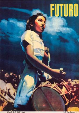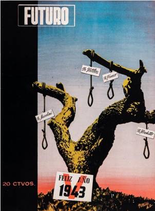 Desde su llegada y hasta finales de los años cuarenta, destacan igualmente las portadas de la revista marxista Futuro, cuyas cubiertas (Fig. 2), al huir de una maqueta prefijada, se convirtieron en manos de Renau en pequeños, variados y vistosos carteles políticos en los que incluía, más allá de las leyes de la retórica visual metafórica al uso, el empleo sistemático de emblemas y símbolos políticos, así como la utilización contrastada de una gama de colores escogida en función de sus cualidades o por sus connotaciones psicológicas. Muchos de estos elementos habían sido usados por él en su etapa española y serían combinados con una semántica mucho más compleja en Fata Morgana y después en The American Way of Life, como podemos observar en el caso de la portada del número de noviembre de 1942, donde la estrella roja guía a la familia hacia un futuro prometedor. El impacto visual era el principal objetivo de “Feliz Año 1943” (Fig.3), de influencia goyesca, donde se alza un tronco pelado, que sirve de patíbulo a los grandes dictadores responsables de la montaña de cadáveres que ha producido la guerra. De sus ramas cuelgan los carteles con los nombres de Hitler, Mussolini, Franco e Hirohito y sus correspondientes sogas dispuestas para la ejecución.