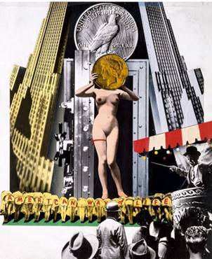 Un año después realiza el óleo Trópico, una pintura negra sobre el desastre global de la II Guerra Mundial y dentro de esa temática, aunque fiel de nuevo a la técnica del fotomontaje, produce “In the land of the Dollar. Bedlam”, 1946, donde presenta escenas de manicomios con enfermos tirados por el suelo que sobreviven en una situación insostenible. ¡Del mismo año es “No… let him play! (No… ¡Dejadle jugar!)” en el que la boca de un enorme cañón amenaza a un niño inocente que corre tras la pelota. De hecho, la última época mexicana, desde 1950 a 1957, está marcada por el inicio de la serie de fotomontajes The American Way of Life, que no finalizaría hasta años después de su llegada a Berlín y de la que se destaca la paradigmática “American Parade” (Fig. 4).
