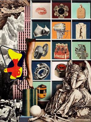Entre todos los fotomontajes sobresale su emblemática “Melancolía fotogénica” (Fig. 6), una realización vanguardista que se adscribe al código iconográfico por antonomasia del arte occidental y toma como referentes las imágenes de Durero de 1514 y de Marcel Gromaire de 1925. Renau lanza un grito frente al imperialismo yanqui a fin de recuperar al humanismo de las garras de la indiferencia. La “Melancolía fotogénica”, a diferencia de las otras, es una fuerza reactiva que impulsa a luchar por una sociedad sin guerras y sin alienación humana. ¡Cuántos elementos del código iconográfico clásico descubrimos en este fogonazo de Renau!: la tela de araña que representa el laberinto del tiempo en el que estamos presos; la labor creativa, con la imagen de la especulación y la introspección propias del ser humano; el reloj que marca impasible el paso de los días; la geometría, única forma que tenemos de hacer conmensurable nuestra realidad; el calendario… En la “Melancolía fotogénica” se revelan, además, otros elementos propios de nuestro tiempo donde se identifica la automática producción de armamento; la seductora lencería de encaje; el combustible, gasolina negra del consumo. El murciélago de Durero y las bombas de Gromaire están representados ahora por la fuerza de una energía atómica aterradora. Renau suma las Melancolías dentro de los cánones de la cultura barroca de las postrimerías de la muerte de Valdés Leal. En un altar consagrado a la energía atómica, se unen en fatídicas bodas Amor y Muerte (vestida ésta para matar, con medias ahumadas, liguero, sostén femenino y barra de carmín) a la manera de Marx Ernst. Allí in ictu oculi el ángel exterminador une los fúnebres esqueletos.