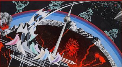 A pesar de ciertas dificultades con los colaboradores y no pocas polémicas con las autoridades, Renau pudo retomar su función como muralista haciéndose portavoz de las ideas utópicas del comunismo. Por encargo del gobierno de la RDA desarrolló el programa iconográfico de propaganda política de grandes murales en edificios públicos en Halle (Saale) como La conquista del sol o El uso pacífico de la energía atómica y, en Berlín, La conquista del cosmos (Fig. 7). Otros bocetos fueron realizados para el Círculo de la televisión y en Erfurt llevó a cabo Las fuerzas de la naturaleza o La naturaleza, el hombre y la cultura.3 Bastantes de ellos han desaparecido, pero queda suficiente documentación de las labores preparatorias donde se manifiestan los intereses ideológicos y la revolución científico-tecnológica que se prometía la antigua república democrática, además de difundir los éxitos del país dentro de la esfera política comunista (Sucrow, 2013). Con estos murales satisfacía el deseo de que la pintura saliera de los museos para ocupar las calles y que todo el público pudiera disfrutarla, aunque tuviera que hacer algunas concesiones a la hora de materializar la figuración, debido al tamaño de las obras, la necesaria utilización de las tres dimensiones y la perspectiva, que debían alcanzar para ser visibles desde diferente ángulos; lo que le llevó a aceptar ciertos principios de la abstracción de la que había renegado antes (Thiele, 1975, p. 225). Las partes estaban unidas por ritmos visuales, líneas de fuerza y juegos prospectivos relacionados, además de por el uso del color y los símbolos propios del arte realista comunista, si bien la disposición morfológica geométrica de los elementos se debía más a la influencia de la pintura futurista, lo que le aseguraba la integración y compensación visual definitivas. (Forment, 1992, p. 156).