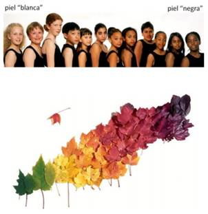 Una de las características distintivas del mundo al que accedemos mediante nuestro sistema visual es que se desarrolla en una continuidad donde no siempre hay oposiciones tajantes ni cambios bruscos. Ciertamente somos capaces de percibir bordes y objetos bien diferenciados, colores que se destacan unos sobre otros, a veces con un alto grado de contraste entre sí. Pero otras veces las sensaciones visuales presentan una variación gradual en pasos tan pequeños que resultan casi indiferenciables. Los elementos o signos básicos que construyen ese mundo visual para nuestra cognición admiten este tipo de variación en forma gradual. Son los distintos contextos en que aparecen lo que hace que se presenten de una forma más o menos neta, más o menos difusa. Los colores, por ejemplo, admiten cambios graduales de tonalidad, claridad y saturación. A partir de esos tres rasgos somos capaces de diferenciar más de un millón de colores, y ello es un indicador de que esas variaciones se pueden producir en pasos casi imperceptibles mediante una continua transición de unos a otros. Un par de ejemplos de estas gradaciones cromáticas los podemos encontrar en las pequeñas variaciones tonales que ofrece la piel humana entre un espectro bastante amplio de colores, así como en una colección de hojas extraídas de los árboles en diferentes épocas del año, donde la naturaleza —mediante cambios químicos y físicos sobre la materia— se ha encargado de configurar una variada pero continua gama cromática (Figura 1a).