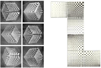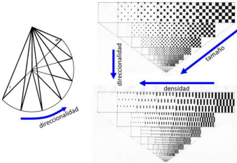 Jannello (1961) también propuso un modelo cúbico para organizar texturas visuales. Las variables son, en este caso, direccionalidad, tamaño y densidad de los elementos texturantes que, por repetición, generan una textura (Figura 4d). Utilizando las mismas variables, he propuesto una manera algo diferente de organizar las texturas, un ejemplo de la cual se puede ver en la Figura 4e (Caivano, 1990 y 1994).