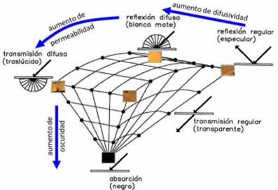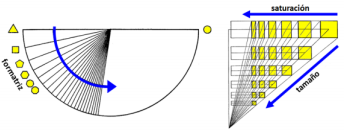 También hay modelos que organizan e identifican sensaciones visuales de brillo, transparencia, traslucencia, apariencia mate, etcétera, a las que Jannello englobó bajo el nombre de “cesía”. Mi aporte posterior fue desarrollar un modelo con tres variables en relación con la percepción de la luz que interactúa con un objeto o superficie: permeabilidad, oscuridad y difusividad (Caivano 1991). Este modelo puede dar cuenta de los cambios graduales entre oscuro y transparente, transparente y opaco, brilloso y mate, y muchas otras situaciones que vemos en la vida diaria (Figura 4f). Finalmente, cabe mencionar la propuesta de organizar un modelo para la descripción gradual de movimientos, en términos de signos visuales (Caivano, 1999).