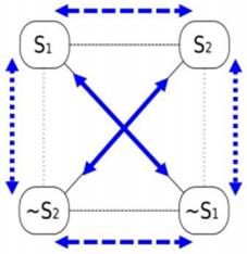 Además, sostenemos aquí que los desarrollos basados en la semiótica peirceana son más adecuados para los estudios visuales que las estructuras dualistas ancladas en la lingüística. El cuadrado semiótico greimasiano, por ejemplo, basado en las operaciones de aseveración y negación, con las relaciones de contrariedad, contradicción y complementariedad, participa más bien de la concepción binarista de la semiosis (Figura 5a). Ciertamente es útil para muchos casos, pero resulta inoperante cuando es necesario dar cuenta de tipos de semiosis no binaria más complejos, como suele ser el caso de la semiosis visual. Sin embargo, si las conexiones se entienden como casos intermedios o transiciones, el mismo modelo binarista puede transformarse en uno gradualista (Figura 5b).