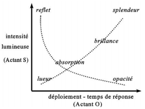 En este sentido, Jacques Fontanille (1998) desarrolla, ciertamente desde una perspectiva greimasiana, un modelo o espacio tensivo aplicado en este ejemplo a la semiótica de la luz, que, incluso cuando se basa en oposiciones, considera transiciones y casos intermedios (Figura 5c). Debemos tener en cuenta que para los casos intermedios no hay nombres disponibles (o solo un par de ellos, como máximo), ya sea en francés o en cualquier otro idioma. En otro diagrama, Fontanille muestra el desarrollo del espacio tensivo a partir del cuadrado semiótico (Figura 5d).