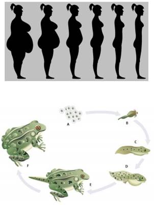Esta observación también es aplicable a las formas espaciales, al campo de la morfología en general. Los procesos de metamorfosis (cambios graduales de forma o transformaciones) son muy comunes en la naturaleza y la biología. Por ejemplo, existen innumerables formas diferentes de cuerpos humanos entre gordos y delgados, altos y bajos. Hay un ejemplo de metamorfosis que es clásico: es posible seguir día a día los pequeños y casi imperceptibles cambios que sufre una rana, desde el estadio de huevo al de adulto, pasando por las etapas de embrión y renacuajo (Figura 1b). Ahora bien, sólo disponemos de cuatro o cinco palabras para designar los diferentes pasos en esa metamorfosis. Pero una serie fotográfica de esa transformación puede mostrar cientos de casos. Es decir, la serie visual por sí misma, sin necesidad de adjudicar un nombre a cada estadio o a cada pequeña modificación, logra plasmar una clase de diferenciación que es imposible realizar verbalmente. Con sólo mirar la secuencia podemos comprender ese proceso en forma cabal.