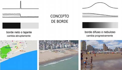 El concepto de borde también es relevante en este contexto. Bardier describe dos tipos de bordes: borde neto (o tajante), donde se produce un cambio brusco, y borde difuso (o nebuloso), donde se produce un cambio progresivo (Figura 7, arriba). Pero lo que aparece en una escala con un borde neto, resulta tener un borde difuso en otra escala. Veamos un ejemplo. Una ciudad a orillas del mar tiene un límite, representado en un mapa por una línea o un cambio de color abrupto que divide la tierra del agua. Pero cuando vemos la orilla del mar “real”, tal borde no existe: las olas van y vienen y el límite cambia continuamente (sin mencionar los cambios producidos por las mareas). E incluso, si fuese posible eliminar olas y mareas, el límite entre arena húmeda y seca también es bastante difuso. Así es que existen innumerables escalas intermedias, donde el borde no es tan neto ni tan difuso (Figura 7, abajo).
