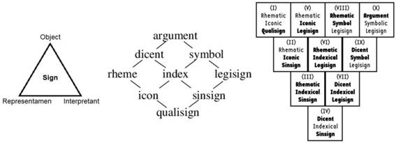 Los diagramas peirceanos de la semiosis son dinámicos por definición, porque la semiosis se entiende como un proceso relacional que admite muchas situaciones. A partir de la relación triádica de representamen, objeto e interpretante, se pueden derivar nueve clases de signos: cualisigno (signo que es una cualidad), sinsigno (signo singular), legisigno (signo que es una ley o convención) (1º); icono, índice, símbolo (2º); rhema, dicisigno (signo dicente), argumento (3º). Y al conectar estos signos, es posible obtener diez relaciones sígnicas (Figura 9a).