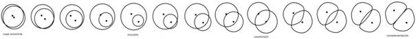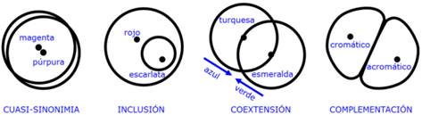 Es fácil ver que entre las cuatro categorías —inclusión, sinonimia, coextensión y complementación— (Figura 11a) se puede establecer una variación gradual ampliando o moviendo las extensiones semánticas. La Figura 11b muestra una secuencia gradual de este proceso. Esto permite explicar la evolución de los nombres básicos de color y dar cuenta de las etapas intermedias. La coextensión, y a veces también la inclusión, actúan como etapas intermedias entre la cuasisinonimia y la complementación. Esto viene a explicar el momento en que un lenguaje está evolucionando para producir nuevas categorías cognitivas. Recordemos la famosa frase de Peirce: ¡Los símbolos crecen! (ver también Short, 1988). Se trata de un proceso dinámico. Cuando un signo está evolucionando para convertirse en símbolo, aparecerán algunos signos intermedios durante ese trayecto.