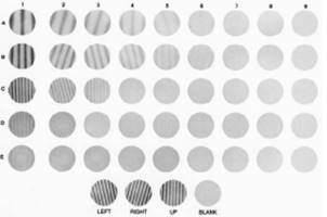 Las texturas visuales y las cesías (transiciones entre transparencia, traslucencia, opacidad y brillo) también pueden cambiar de manera continua e indistinguible. En la Figura 2a se describen tres estados visuales mediante las palabras transparente, traslúcido y mate. Pero entre ellos hay una variación visual continua, donde es difícil establecer límites. Por otra parte, casi nada es más continuo que la percepción visual del movimiento. Las series fotográficas de Muybridge, por ejemplo, y posteriormente el proceso cinematográfico, han podido simular el movimiento a partir de una sucesión de fotogramas estáticos que captan cambios de forma, posición, iluminación, etcétera, en pequeños intervalos. El resultado es una continuidad fluida (Figura 2b). Las pruebas de agudeza visual realizadas por oftalmólogos tienen caracteres o formas con una disminución gradual de tamaño. Las pruebas de Ishihara y de Munsell-Farnsworth, diseñadas para detectar deficiencias en la visión del color, utilizan variaciones con grados de diferencia tonal muy pequeña entre elementos (Figura 2c). Las pruebas de visión de contraste utilizan patrones lineales con ligeros cambios de orientación, tamaño, separación y grado de nitidez o contraste de las líneas (Figura 2d). Todos estos ejemplos nos demuestran que el sentido de la visión puede detectar pequeñas modificaciones de formas, tamaños, colores y texturas.