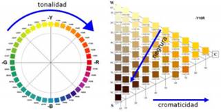 Existen modelos que organizan e identifican miles de colores en términos de una gradación en tres dimensiones, por ejemplo, el Sistema Natural del Color (NCS, Natural Color System), desarrollado en Suecia, que utiliza las variables de tonalidad, negrura y cromaticidad (Figura 4a). Cualquiera de los varios sistemas de ordenamiento y atlas de colores modernos, como el Munsell, Küppers, Coloroid y otros, así como espacios de color que se han convertido en estándares para la colorimetría, como el CIELAB, funcionan de manera similar. Es decir, a partir de tres dimensiones que se corresponden con tres variables del color y se representan en un espacio volumétrico, ubican inequívocamente en los puntos de ese espacio a todos los colores posibles y proveen una notación única, código o denominación específica para cada uno de ellos. Notación y ubicación en el espacio cromático respectivo son dos cuestiones que van de la mano, una se corresponde con la otra.