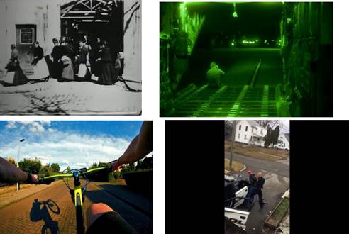 A primera vista, se puede fácilmente reconocer que se trata, respectivamente, de una imagen de cine de los primeros tiempos por ser en blanco y negro y de baja definición, de una imagen nocturna tomada por una cámara de vigilancia, en virtud de sus tonos verdes típicos, de una imagen producida por una cámara de acción tal como una GoPro o un aparato de gran angular, a causa de la distorsión de la perspectiva sobre los bordes de la imagen, y finalmente, de una imagen tomada con un smartphone por la relación de aspecto del espacio de representación.