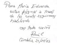 Ahora bien, avancemos un peldaño más en la relación de la escritura con el espacio. Nos instalamos frente a la página que muestra las grafías de un mensaje. Leo, por ejemplo, la dedicatoria que Raúl Dorra me escribió al obsequiarme uno de sus libros (Fig. 1):