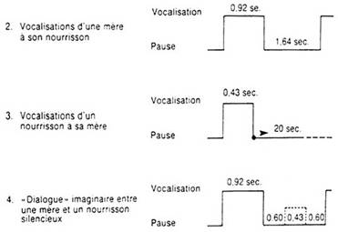 Analizando, incluso estadísticamente, los diálogos madre-bebé durante el primer semestre, Stern señala la existencia de una pausa anormalmente larga (ver arriba en 4 el “diálogo” imaginario) en el siguiente diálogo tipo durante una situación común de alimentación con biberón; el bebé acaba de rechazar el chupete: