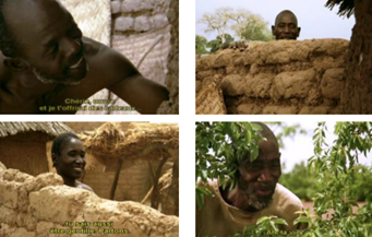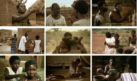 En el espacio cerrado y segmentado de la aldea, así como en sus alrededores inmediatos, casi siempre hay alguien mirando, por encima, al lado o detrás de un muro bajo u otro obstáculo, observando el castigo físico infligido a un niño, la caricia recibida por una esposa o amante, la mano que toma otra mano, etcétera. Estos observadores no son necesariamente malintencionados, aunque a veces lo sean, pero su mera presencia implica la mirada de un tercero, intruso en la escena y, sobre todo, ancla las interacciones interindividuales en el espacio social de la aldea. Cuando el espectador asiste a una de estas interacciones, es previsible que tenga que compartir el espectáculo con uno de los miembros de la aldea, al que descubre en un plano recortado (imágenes 10-13) al final de la secuencia.5 Además, este desdoblamiento del observador introduce un juicio (a través de la expresión facial del aldeano observador: enfadado, hostil, sonriente, benévolo, a veces incluso duplicado por un comentario verbal) que influye necesariamente en la mirada del espectador, obligándolo al menos a tomar posición, si no a adoptar ese mismo juicio.