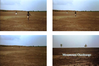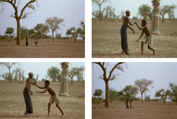 En el caso 1, en Yaaba, en los planos de apertura y de cierre, los dos niños, Bila y Nopoko, corren juntos hacia las profundidades, lejos de la aldea (imágenes 22-25): van en busca de otro mundo, aún desconocido, y experimentan los juegos de la infancia como la apertura a una vida adulta en una zona utópica aún por determinar.