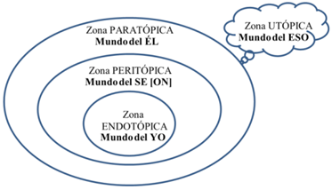El modelo en cuestión es el de las zonas semióticas “antrópicas” (endotópica, peritópica, paratópica y utópica), comparable al de Greimas y Courtés (1979),7 pero completamente reconfigurado, porque nos parecía demasiado fuertemente marcado por su origen cultural, el del cuento europeo, y sobre todo porque no está centrado. Este modelo también es comparable al modelo de las tres zonas antrópicas de François Rastier (2001),8 más generalmente marcado por el concepto de deixis que prevalece en las lenguas y culturas indoeuropeas (aquí, allí, en otra parte). Nuestro modelo está centrado (a diferencia del de Greimas), porque las formas de vida se organizan en torno a una instancia de referencia, su centro organizador. Contiene cuatro zonas (a diferencia del de Rastier, que tiene tres), porque no hemos tomado como referencia la triplicación de la categoría de persona en las lenguas indoeuropeas, y hemos optado por distinguir dos zonas distantes, y no sólo una: la zona remota por la distancia espacio-temporal y la fuerza de una frontera (zona paratópica), y la zona remota por la transición hacia otros modos de existencia, otras condiciones de verdad, otros mundos semióticos (zona utópica).