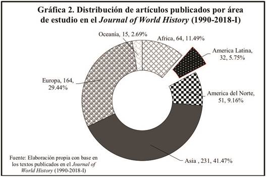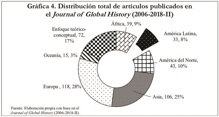 Consideramos que todo este panorama ratifica la periferización de nuestro continente en estas influyentes narrativas. Es por ello que ahora nos cuestionamos específicamente ¿si existen acaso otro tipo de trabajos inscritos en estas metanarrativas que ponderen de una manera distinta la participación de América Latina en la historia global, además de no estar inscritos directamente en las tradiciones historiográficas latinoamericanas? ¿Qué hay detrás de dichos resultados? ¿Qué se escribe exactamente sobre América Latina a pesar de su evidente periferización en el discurso hegemónico? A continuación trataremos de contestar estas preguntas específicas, no sin antes aclarar que la periferización de América Latina ratificada tanto en los JWH y JGH es más de carácter cuantitativo, debido a que en la mayoría de los textos que hace referencia a nuestro continente como objeto de estudio principal prevalece una postura crítica hacia estas tendencias hegemónicas. En el siguiente apartado ofrecemos más detalles al respecto.