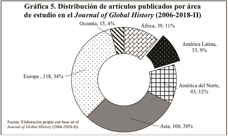 La segunda revista analizada fue el JGH. A pesar de los esfuerzos editoriales y los argumentos vertidos por Patrick O’Brien (2006) en el número inaugural, centrados fundamentalmente en las diversas tradiciones historiográficas que prevalecerían a nivel mundial,4 más de un cuarto (28%) de los artículos totales publicados entre 2006 y parte de 2018, según el criterio de estudios de área y los enfoques teórico-conceptuales, tuvieron como tema principal Europa (118), una proporción similar (25%) se dedicó a Asia (106); mientras que América Latina sólo tuvo el 8%, es decir, 33 artículos en más de doce años de publicación (Gráfica 4). Si solamente se incluye el criterio de estudios de área, el porcentaje para América Latina se incrementa en apenas un punto (9%), Europa abarca más de un tercio de los trabajos publicados (34%) y Asia se incrementa hasta el 30%, es decir, la periferización bajo este rubro sigue latente (Gráfica 5).