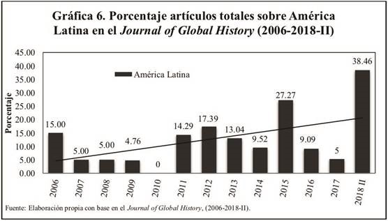 No obstante a ello, la distribución de artículos cuyo tema principal ha sido América Latina tiene una mejor repartición a lo largo del tiempo, prácticamente durante todos los años de publicación han aparecido textos al respecto, salvo 2010, con una tendencia creciente en los últimos números. Al igual que el JWH, 2018 parece un año promisorio en cuanto al número de trabajos publicados en el JGH, ya que la proporción en los primeros dos números ha sido alta con respecto a lo visto años atrás. Pero, se necesitarían al menos 10 años de publicaciones constantes sobre América Latina para equilibrar la balanza al respecto (Gráfica 6).