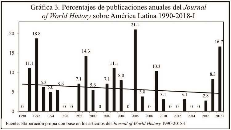 Con base en una distribución de artículos publicados en el JWH, de 1990 al primer número de 2018, sustentada en los criterios de estudios de área cultural y en los enfoques teóricos conceptuales, destaca que entre Asia (231)2 y Europa (164) se repartieron más del 60% de las publicaciones totales según esta clasificación. Por su parte América Latina (32) sólo alcanzó 4.95%. Si dejamos de lado los artículos con un enfoque teórico conceptual, que no hacen una referencia explícita a un espacio geográfico en concreto, la representación de América Latina se incrementa en menos de un punto porcentual, esto es, 5.75% (Gráficas 1 y 2). Incluso, la aparición de América Latina como objeto principal de estudio es tan intermitente que hay al menos 10 años intercalados a lo largo de la vida de esta revista que no se publicó ningún artículo sobre este continente, más bien la tendencia es hacia la baja, no obstante que 1992 y 2006 fueron los mejores años, cuyo porcentaje de trabajos publicados alcanzó el 18.8 y 21.1% en ese orden; 2018 parece que será también un año importante en el rubro de publicaciones sobre nuestro continente (Gráfica 3).