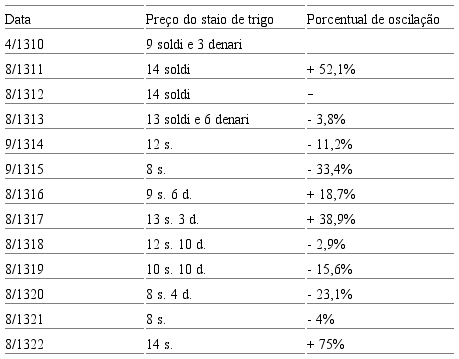 A escassez de 1329-30, em Florença, é bastante diferente da crise alimentar ocorrida no norte da Europa entre 1315 e 1322. A sucessão de invernos excessivamente rigorosos e de verões excessivamente chuvosos atingiu, ainda que de maneira desigual, vasta área do norte da Europa; a queda sucessiva da produção agrícola, resultante das intempéries climáticas, conduziu à inflação dos preços dos cereais perceptíveis na Inglaterra, em Flandres, no norte da França, e em diversas regiões do império; as crônicas do período relatam a incidência da fome (JORDAN, 1996). A despeito da existência de conexões capazes de cobrir um extenso arco espacial – o centeio produzido em Brandenburgo era vendido em Flandres –, Chester Jordan (1996) prefere a hipótese de que a carestia decorreu não da integração de um espaço comercial, mas, sobretudo, da queda generalizada da produção de trigo e de cereais menores. Seja como for, é interessante acompanharmos a evolução dos preços na cidade de Florença (Tabela 1).7