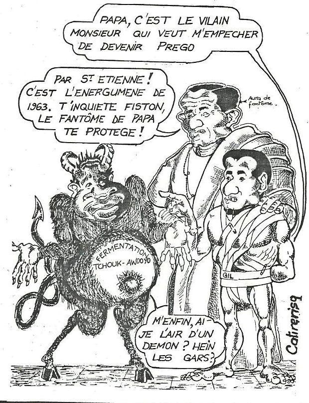 L’illustration faite ici montre Sylvanus Olympio, premier président du Togo accompagné de son fils, Gilchrist Olympio (à sa gauche). Ce dernier doigte un animal hideux au visage quelque peu humain qui, selon lui, l’empêche de devenir président du Togo, se référant à l’attentat dont il a été victime à Soudou le 5 mai 1992. Olympio père dévisage l’animal et dit à son fils que c’est l’énergumène de 1963, cause de sa propre mésaventure (faisant allusion au coup d’État dont il a été victime au cours de cette année). Il rassure par la suite son fils, lui disant que son fantôme le protègera contre le démon. Ce dernier réagit, en demandant aux deux s’il avait l’air d’un démon. Selon ce journal, Eyadéma n’est qu’un démon un animal hideux qui, même s’il ressemblait à un homme, ne peut que se saouler la gueule avec les boissons fermentées (Awooyo et Tchoukoutou-bière locale-), comme l’indique l’inscription sur la poitrine de l’animal.