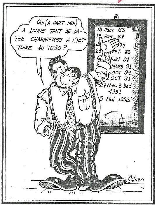 Mais à partir de la décennie 1990, les mutations intervenues dans la politique internationale, occasionnées par l’effondrement du communisme, eurent pour conséquences en Afrique en général, un renouveau dans les systèmes politiques. Ceux-ci se caractérisent, entre autres, par la fin des partis uniques et l’ouverture du continent au multipartisme. La lutte pour la démocratie ainsi lancée a conduit, dans bien des endroits sur le continent, à l’organisation de conférences nationales. Au Togo, elle eut lieu du 8 juillet au 28 août 1991. L’un des acquis de cette conférence est la naissance, à foison, des organes de presse et, plus tard, l’adoption d’une loi plus libérale en 19987 en faveur des journaux. Toutefois, avant même que cette loi qualifiée de plus libérale ne soit adoptée, la presse contestataire et satirique émergea. C’est dans ce sillage que la caricature prit ses assises. Les journaux La Parole et Kpakpa désenchanté se sont illustrés dans la satire.