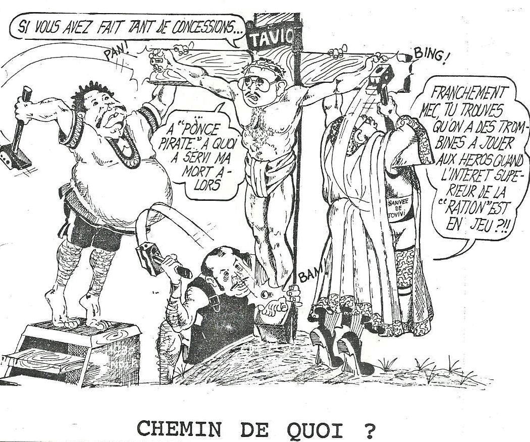 Cette caricature se rapportant à l’assassinat de Tavio Amorin, dont nous avions parlé plus haut, titre « chemin de quoi », tournant en dérision, « le chemin de croix » des catholiques au bout duquel Jésus-Christ a été crucifié. Effectivement, on voit Tavio Amorin en train d’être crucifié. Mais alors, par qui ? Par ses frères de l’opposition tout comme la crucifixion du Christ aussi fut ordonnée par ses frères juifs. Même si la ressemblance est bien forte entre les deux cas comparés ici, il est à rappeler que dans la réalité, Amorin n’a jamais été crucifié. Il a été assassiné par la garde prétorienne. Cela étant, quel est alors le sens réel de cette image ? Le caricaturiste veut simplement montrer que la mort de Tavio Amorin fut finalement une mort gratuite ; car les causes qu’il défendait et qui faisaient de lui un opposant intransigeant, ce qui lui a valu la mort, n’ont pas été véritablement poursuivies par ses frères de l’opposition. Voilà pourquoi sur la croix, Amorin pose la question suivante aux opposants : « si vous avez fait tant de concessions à «Ponce pirate», à quoi a servi alors ma mort ? ». Il fait ainsi allusion à tout ce qui a conduit à remettre le président Eyadema au pouvoir alors qu’Amorin était bien convaincu qu’il quitterait le pouvoir. Koffi Kodjo décrit, à sa manière, ces concessions :