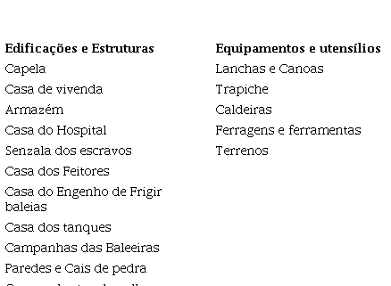 As edificações como a Casa de Engenho de Frigir Baleias, Casa dos Tanques, Campanhas das Baleeiras, Paredes e Cais de Pedra e seus respectivos equipamentos e ferramentas eram destinados ao trabalho de despostejamento da baleia e processamento do óleo, atividade central da Armação. A Capela, Casa de Hospital, constituíam espaços para as práticas religiosas e de saúde. A Casa de Vivenda, Senzala dos Escravos, Casa dos Feitores, Companhas de Baleeiros eram espaços destinados à residência da população baleeira. O Armazém era utilizado para depósito de alimentos e demais recursos necessários para atividades cotidianas e as Casas cobertas de palha abrigavam.34