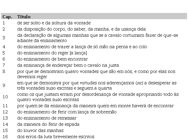 Sobre os avisamentos (sic) para bem ferir de espada a mim parece que razoadamente a cavalo se pode ferir por quatro maneiras. Primeira de talho travesso. Segunda de revés. Terceira sedente de cima para fundo. Quarta de ponta. E a primeira e a segunda me parecem melhores para ferir qualquer homem a cavalo que ande de besta. E para dar grande golpe de talho deve ferir vijnda (sic) do cavalo e do corpo, e da soltura do braço todo juntamente. E que isto achei em torneio muito aprovado [...] (DUARTE, 1843, p. 98).