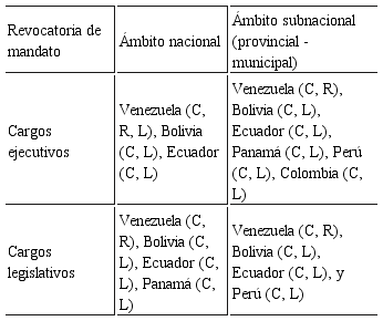 Los países latinoamericanos que incorporaron este mecanismo en sus constituciones nacionales son: Venezuela (1999), Bolivia (2009), Ecuador (1998-2008), Perú (1993-2005), Colombia (1991) y Panamá (1972-1983-2004). Solo los tres primeros la contemplan para todos los cargos de todos los niveles, incluyendo al presidente.