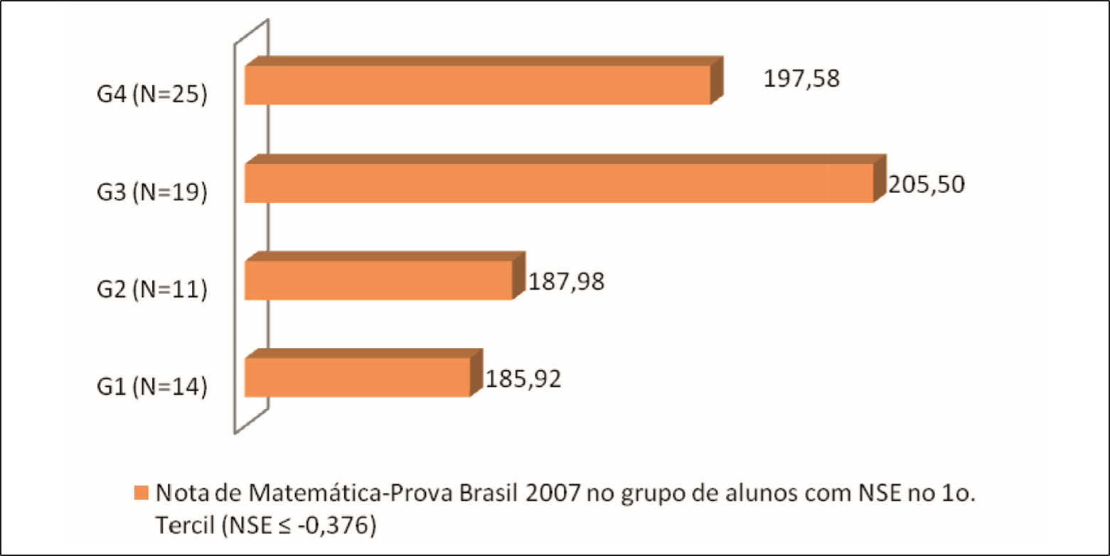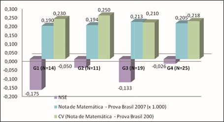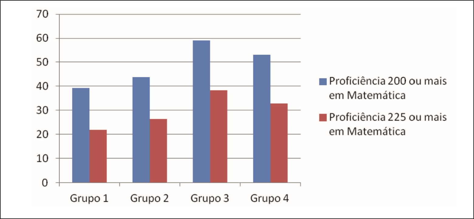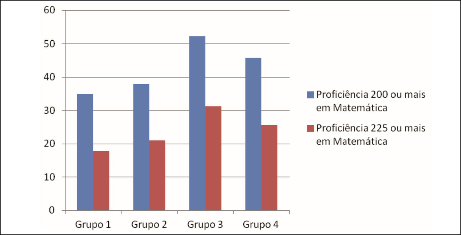Foi calculado ainda o percentual de alunos com menor NSE, com proficiência em Matemática na Prova Brasil 2007 igual ou acima de 200 ou 225, no âmbito de cada um dos agrupamentos.