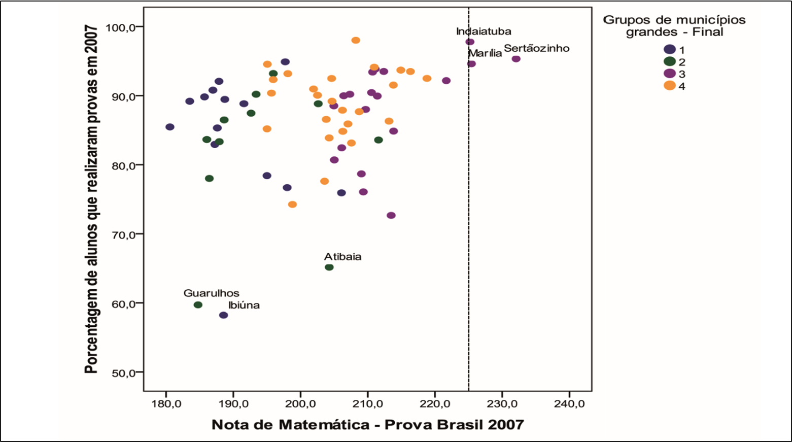 Esses três municípios possuíam os maiores percentuais de alunos com níveis adequados de proficiência em Matemática, cumprindo melhor o critério de justiça “igualdade de base”: aproximadamente 70% contra um máximo de cerca de 60% nos demais, se o corte for 200; e cerca de 50% se o critério for 225, sendo que nos demais municípios esse percentual não ultrapassa 40%.