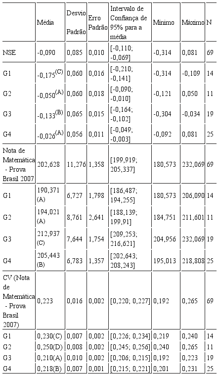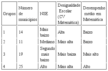Para operacionalizar a ideia de redes de ensino mais justas com base em Dubet (2008, 2009) e, assim, classificar as redes de ensino no que tange à sua proximidade em relação ao princípio de justiça igualdade de base, foram analisados agrupamentos constituídos com os seguintes critérios: média de proficiência em Matemática na Prova Brasil 2007; coeficiente de variação das proficiências dos alunos em Matemática na Prova Brasil 2007 (que representa o nível de desigualdade escolar de cada rede); NSE dos alunos, elaborado a partir dos questionários associados à Prova Brasil 2007 respondidos pelos alunos. Desse modo, considerou-se como sendo mais justas aquelas redes que, atendendo alunos com níveis socioeconômicos mais baixos, conseguem maior desempenho médio dos alunos em Matemática, menor nível de desigualdade escolar (medido pelo coeficiente de variação do desempenho dos alunos em Matemática), e cumprem melhor o princípio de justiça igualdade de base. Ou seja, que conseguem proporcionalmente fazer com que mais alunos cheguem ao nível de desempenho que se considera como adequado, inclusive aqueles alunos com menor NSE. A decisão de verificar o desempenho em Matemática foi baseada em Alves (2009), para quem o desempenho dos alunos nesse conhecimento é mais afeito à relação com o que é realizado pela escola em comparação com o resultado de língua portuguesa.