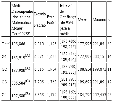 A Tabela 2 e a Figura 2 apresentam as medidas-resumo do desempenho em Matemática na Prova Brasil 2007 no grupo de alunos classificados no 1º tercil de NSE (NSE ≤ -0,422), que representa o grupo de alunos com mais baixo nível socioeconômico.