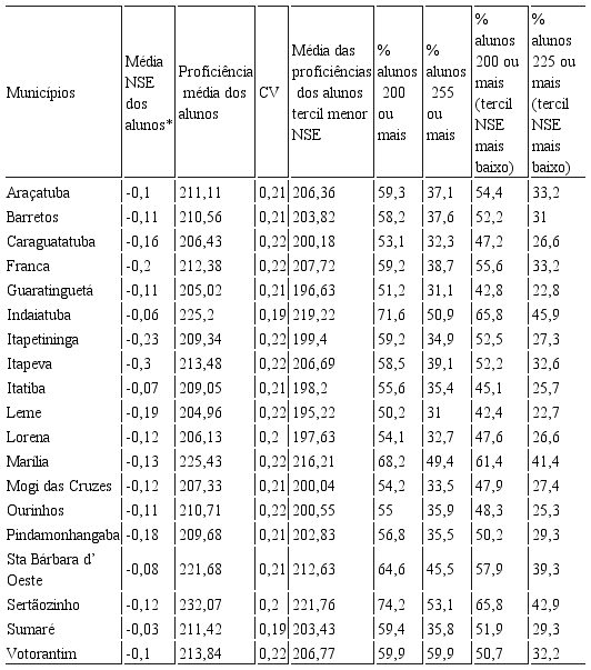 A Tabela 4 mostra a lista de municípios do estado de São Paulo que, nos anos iniciais do ensino fundamental, pelos dados da Prova Brasil em 2007, estão conseguindo maiores níveis de equidade.