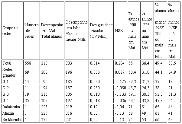 Após calcular um índice de nível socioeconômico dos alunos (NSE) e fazer análise de agrupamentos, foram identificados quatro diferentes grupos de redes de ensino, distintos no que tange à situação de justiça na escola e ao cumprimento do princípio de justiça igualdade de base. Um grupo de 19 grandes redes municipais com alunos de menor NSE consegue obter médias bem mais elevadas, sem que a desigualdade escolar esteja entre as maiores. Esse grupo eleva mais alunos dentre os de mais baixo NSE a níveis mais adequados em termos de desempenho em Matemática: a média da proficiência em Matemática dos alunos com menor NSE é mais elevada que nos demais grupos e o percentual de alunos, inclusive daqueles com menor NSE, que galgam proficiência considerada adequada é significativamente maior nesse grupo do que nos demais. Foram, portanto, consideradas redes mais justas. Dentre as redes mais justas, há três que se destacaram ainda mais, ou seja, localidades que poderiam gerar bons estudos de caso, uma vez que há fortes indícios de que suas políticas educacionais estariam incidindo sobre os resultados detectados.