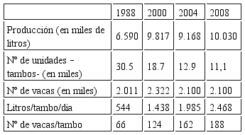 En términos procesuales la modernización de la actividad láctea supuso el incremento de escala, pero se vio acompañada de una fuerte reducción en el número de unidades productivas (Cuadro 1). Otro factor que incide en el mismo sentido es el incremento de las exigencias por parte de las usinas para recibir la leche cruda. El proceso de concentración productiva es mayor que el registrado en el conjunto de las explotaciones agropecuarias del país (MATEOS, 2006) y se acentúa en las situaciones de crisis, que suelen ser recurrentes en la actividad lechera. En este tipo de coyunturas desaparecen unidades, mientras que otras ensayan diversas estrategias de persistencia, que incluyen la elaboración de subproductos.