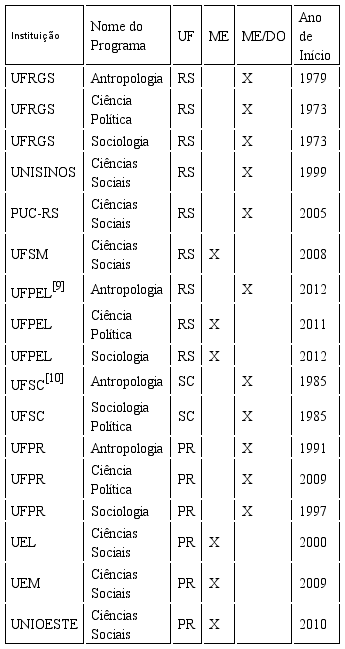 Na Região Sul, os primeiros Programas de Pós-Graduação em Ciências Sociais surgem ainda na década de 1970, havendo atualmente um programa de Sociologia Política, três programas de Ciência Política, três de Sociologia, quatro de Antropologia, e seis de Ciências Sociais, totalizando dezessete programas[8], como podemos observar na tabela abaixo: