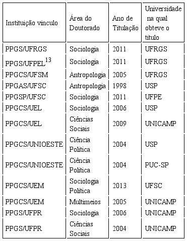 Dentro desta amostra inicial, selecionamos aqueles que possuíssem ao menos três dos quatro indicadores aqui mobilizados, de modo que chegamos a treze pesquisadores, o que representa apenas 3,8% dos docentes que atuam nos Programas de Pós-Graduação em Ciências Sociais da Região Sul. Estes docentes encontram-se distribuídos da seguinte forma institucionalmente: dois no PPGS/UFPR, duas no PPGCS/UEL, dois no PPGCS/UEM, dois no PPGCS/UNIOESTE, um no PPGSP/UFSC, uma no PPGAS/UFSC, um no PPGS/UFPEL, um no PPGS/UFRGS, uma no PPGCS/UFSM.