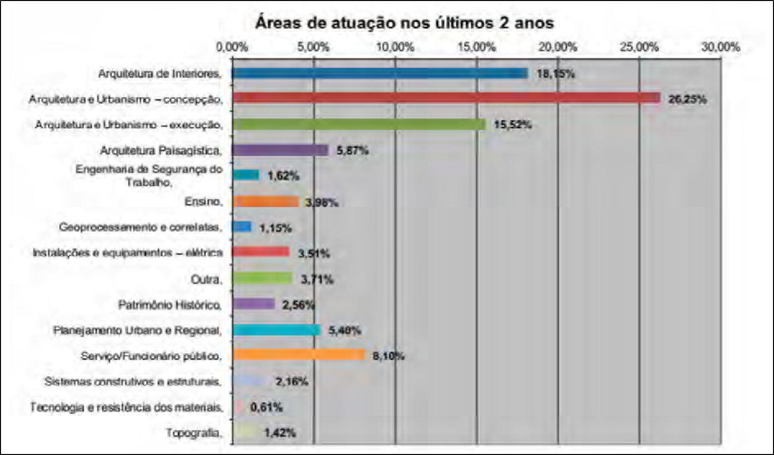 Na Figura 01, podemos observar as áreas de atuação dos arquitetos sergipanos. Assim, para se fazer um recorte mais claro dos requisitos de notoriedade definidos aqui, consideraram-se os sete maiores campos de atuação que possuem uma maior significância de representatividade das atividades da categoria. Portanto, conforme o censo CAU/SE, verificou-se que: 26,25% dos profissionais trabalham, majoritariamente, com concepção de projetos; um número menor, mas significativo, 15,52%, participa regularmente da fase de execução de obras; a arquitetura de interiores é também uma demanda frequente, com 18,15% dos profissionais dedicados a essa área; pequenas parcelas do total da categoria dedicam-se a atividades como planejamento urbano (5,40%), paisagismo (5,87%) e ensino (3,98%); e 8,10% são funcionários do serviço público.