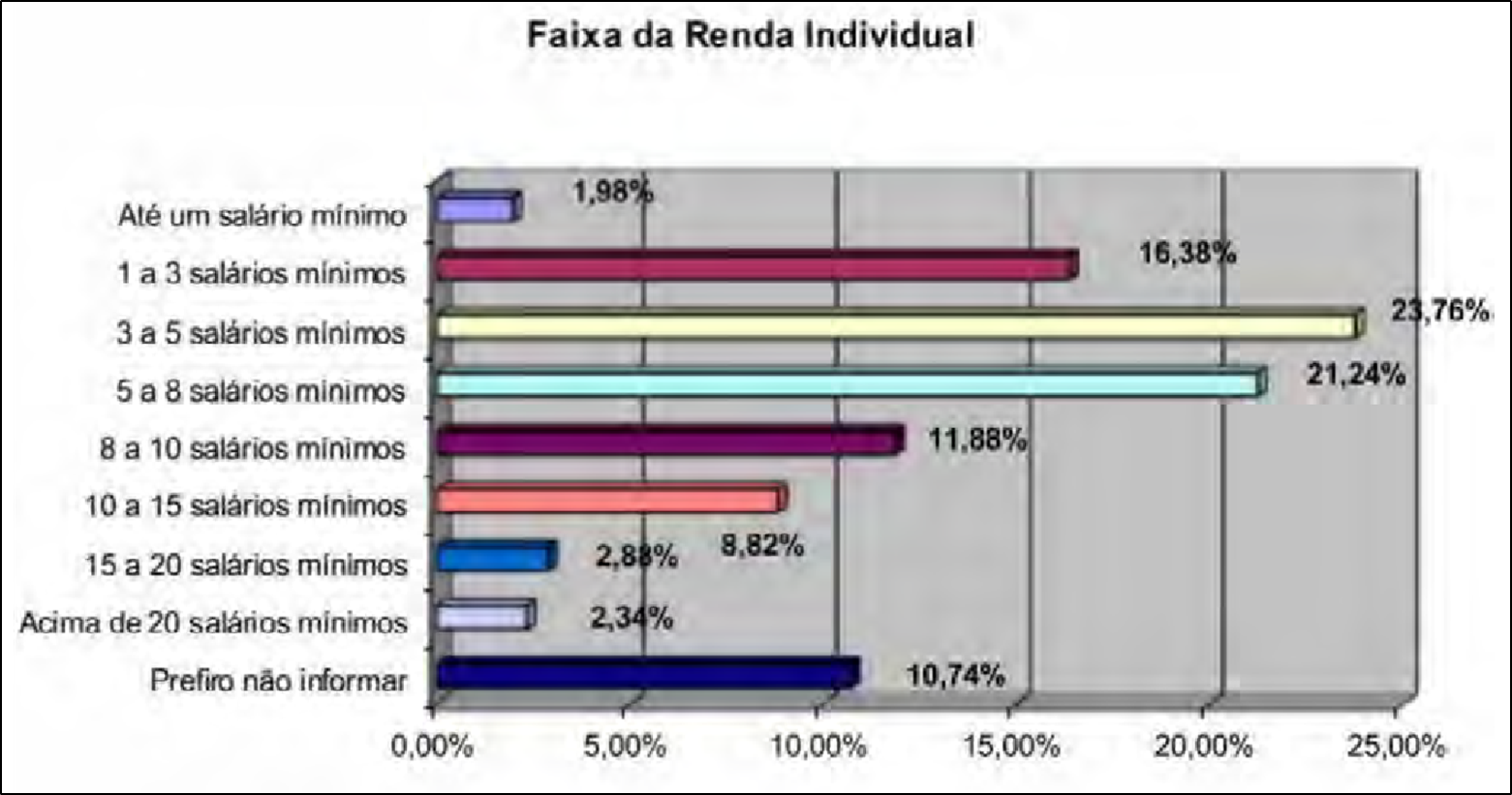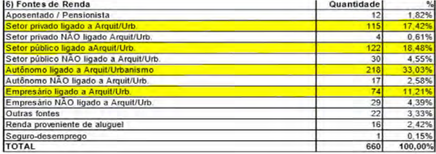 Na Figura 04, conseguem-se identificar, em destaque, as quatro fontes de renda de maior prática profissional dos arquitetos atuantes em Sergipe. Também se identifica, nesse levantamento, a relação das remunerações com alguns segmentos de atuação profissional. Tais atuações estão em foco neste artigo e confirmam a convergência de análise que está sendo realizada. Conforme a Figura 04, estes são os segmentos de atividades de maior atuação no estado: proprietários de empresas de arquitetura, funcionários públicos e profissionais autônomos.