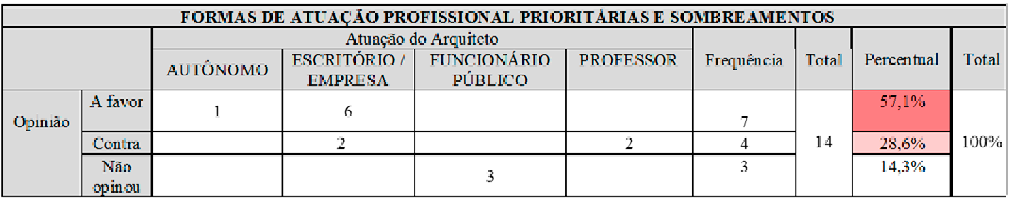 A intenção de criação dos limites de jurisdição não parece ser um interesse coletivo de classe, pois o grau de importância dedicado às questões, relacionadas com os sombreamentos, é determinado a partir de requisitos individuais que podem afetar diretamente a forma particular de atuação do profissional de arquitetura. Dessa forma, dentro do grupo de profissionais arquitetos, são formados outros grupos que passam a se posicionar de acordo com as formas de atuação de cada grupo restrito. Portanto, a fonte de renda e a forma de atuação profissional são critérios fundamentais para determinarem as “bandeiras defendidas” quanto a ser contrário ou a favor do sombreamento.