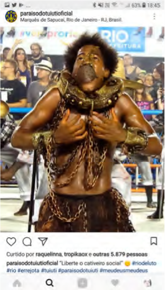 Essa imagem da Paraíso do Tuiuti, publicada em 15 de março de 2018 no Instagram[10], foi uma das mais partilhadas nas redes sociais, ao lado daquela outra que destaca o “vampiro neoliberal”. A Escola de Samba retomou, neste ano, a temática da servidão, fazendo uma reflexão acerca dos 130 anos da Lei Áurea, que extinguiu a escravidão no Brasil.