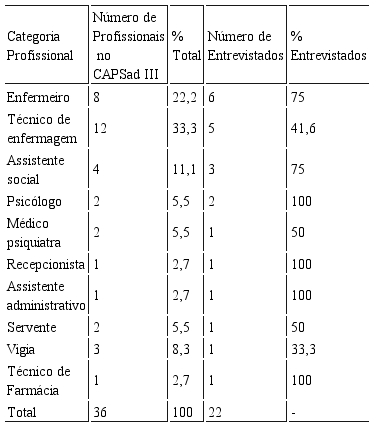 O lócus da pesquisa foi um dentre os oito CAPSad III existentes no Estado do Rio de Janeiro. Essa escolha foi motivada pela necessidade de uma completa imersão do pesquisador no campo, possibilitando a vivência e conhecimento aprofundado do cotidiano local. Foi feito o uso do diário de campo para registro detalhado das informações, de modo que fosse possível captar os “imponderáveis da vida real” (MALINOWSKI, 1978). Na etapa final da pesquisa foram realizadas entrevistas com profissionais da unidade, buscando aprofundar o conhecimento obtido através da observação participante. Na tabela 1, são apresentados os profissionais da unidade e o número de entrevistados.
