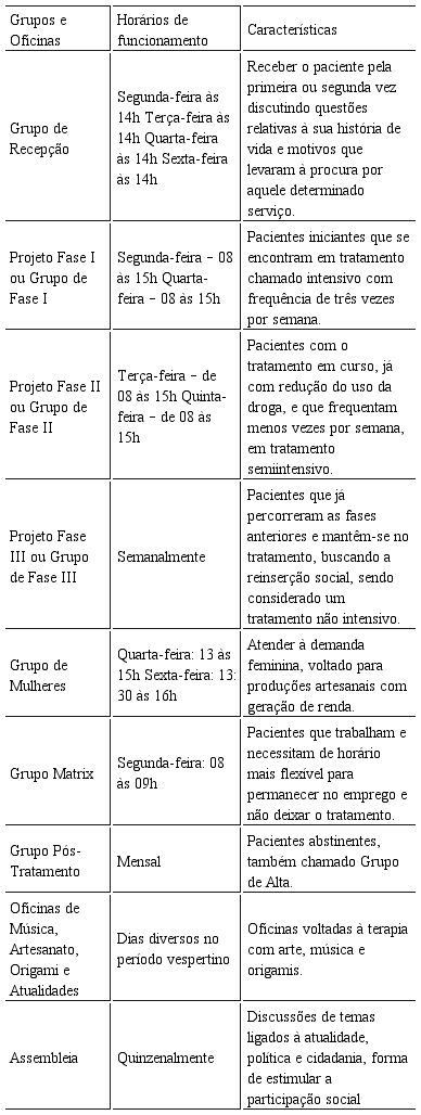 O CAPSad estudado fica na região central do município, sendo de fácil acesso a outros equipamentos de saúde. Embora seja um local de assistência 24 horas, o atendimento ao público acontece de 08 às 17 horas, a não ser para casos de atendimento no chamado “leito psicossocial”. Durante o período noturno permanecem na unidade 1 enfermeiro, 2 técnicos de enfermagem, 1 vigilante patrimonial, profissionais que oferecem atendimento aos pacientes internados. O espaço é amplo, mas a estrutura precarizada. O cotidiano de trabalho é principalmente organizado a partir dos chamados “Grupos”, apresentados na tabela 2.