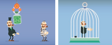 Nessas animações, os políticos são representados como senhores brancos, carecas, com bigode, vestindo terno e cartola. Uma delas mostra estes políticos tendo sacos de dinheiro arrancados de suas mãos por uma máquina e suas roupas sendo trocadas por uniformes de presidiários. Outra animação mostra políticos sendo engaiolados. Interessante ressaltar que nessas animações o político surge sempre personificado, mas quem o pune não aparece, é a máquina estatal, sem face, impessoal. Seguem exemplos: