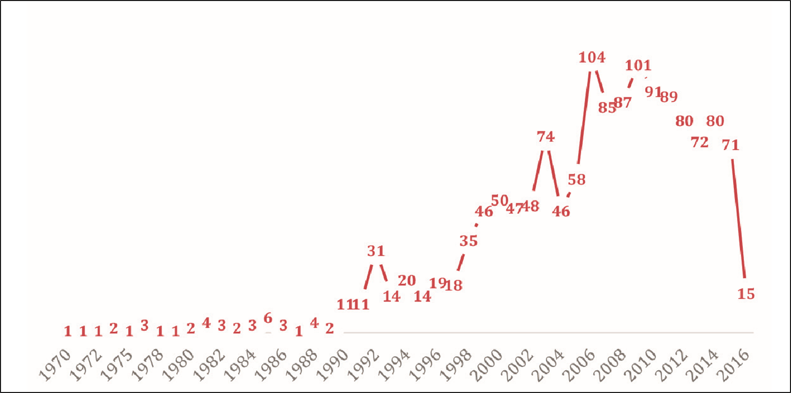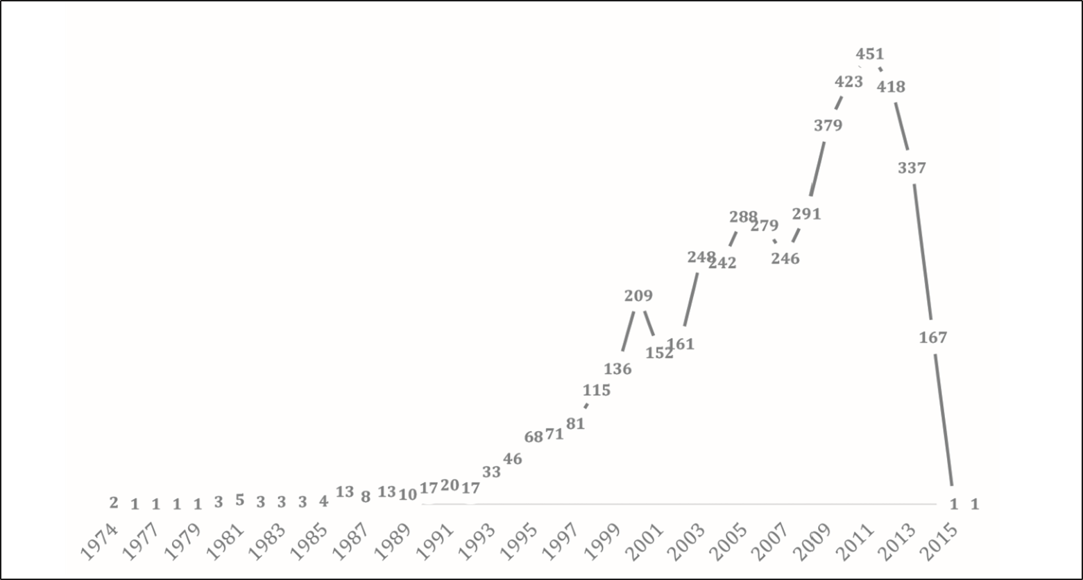 Vemos, no gráfico acima, que, de acordo com o universo pesquisado, a área de “pensamento social” apresenta considerável crescimento ao longo do período que vai desde meados da década de 1990 até atingir um pico em 2011. A queda dos indicadores após 2011 não deve ser automaticamente referida a uma possível diminuição do volume da produção, pois a “cesta” de 938 pesquisadores é estática e, como sabemos, há certa demora no preenchimento das informações no CV-Lattes. A curva de crescimento, acentuada entre 1995 e 2014, é consistente com os dados relativos aos GTs de Pensamento Social no Brasil na ANPOCS e na SBS, bem como com o surgimento de uma geração de pesquisadores que, desde fins da década de 1980, começou a realizar as dissertações de mestrado e as teses de doutorado em “pensamento social”.